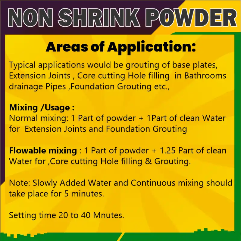 Non Shrink Grouting Powder is a high-performance cement-based grout specially formulated for core sealing around drainage pipes. It provides a perfect bond between reinforced concrete (RCC) and plastic or metal pipes, offering unmatched strength, stability, and long-lasting protection.